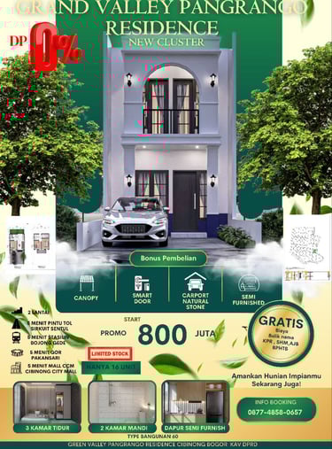 Berlokasi strategis di jantung Cibinong, kami menghadirkan konsep hunian bernuansa hijau dengan fasilitas lengkap — mulai dari taman keluarga, tempat ibadah, hingga sistem keamanan 24 jamSetiap unit di Green Valley Pangrango Residence Cibinong dirancang dengan sentuhan desain modern yang mengutamakan kenyamanan dan estetika.